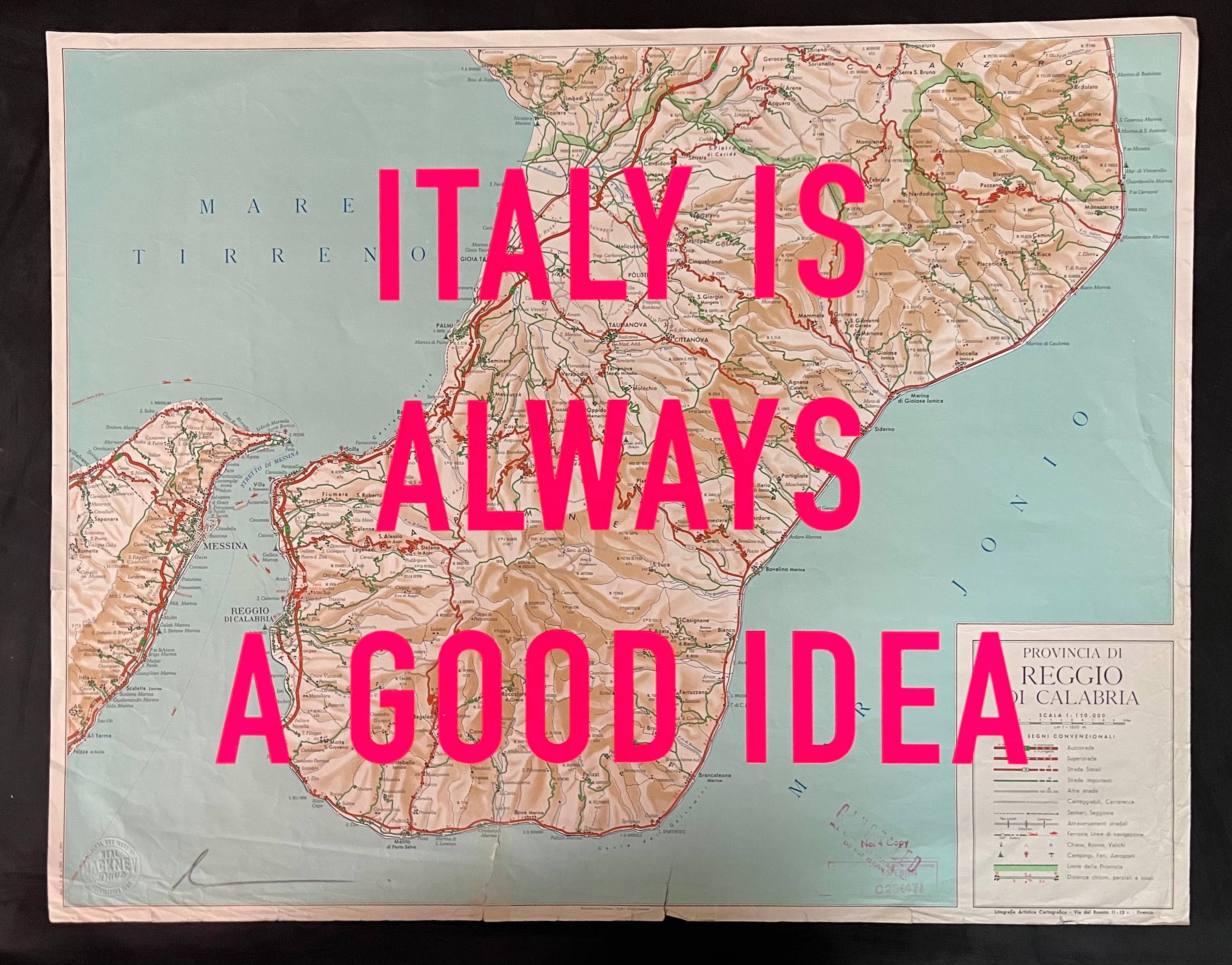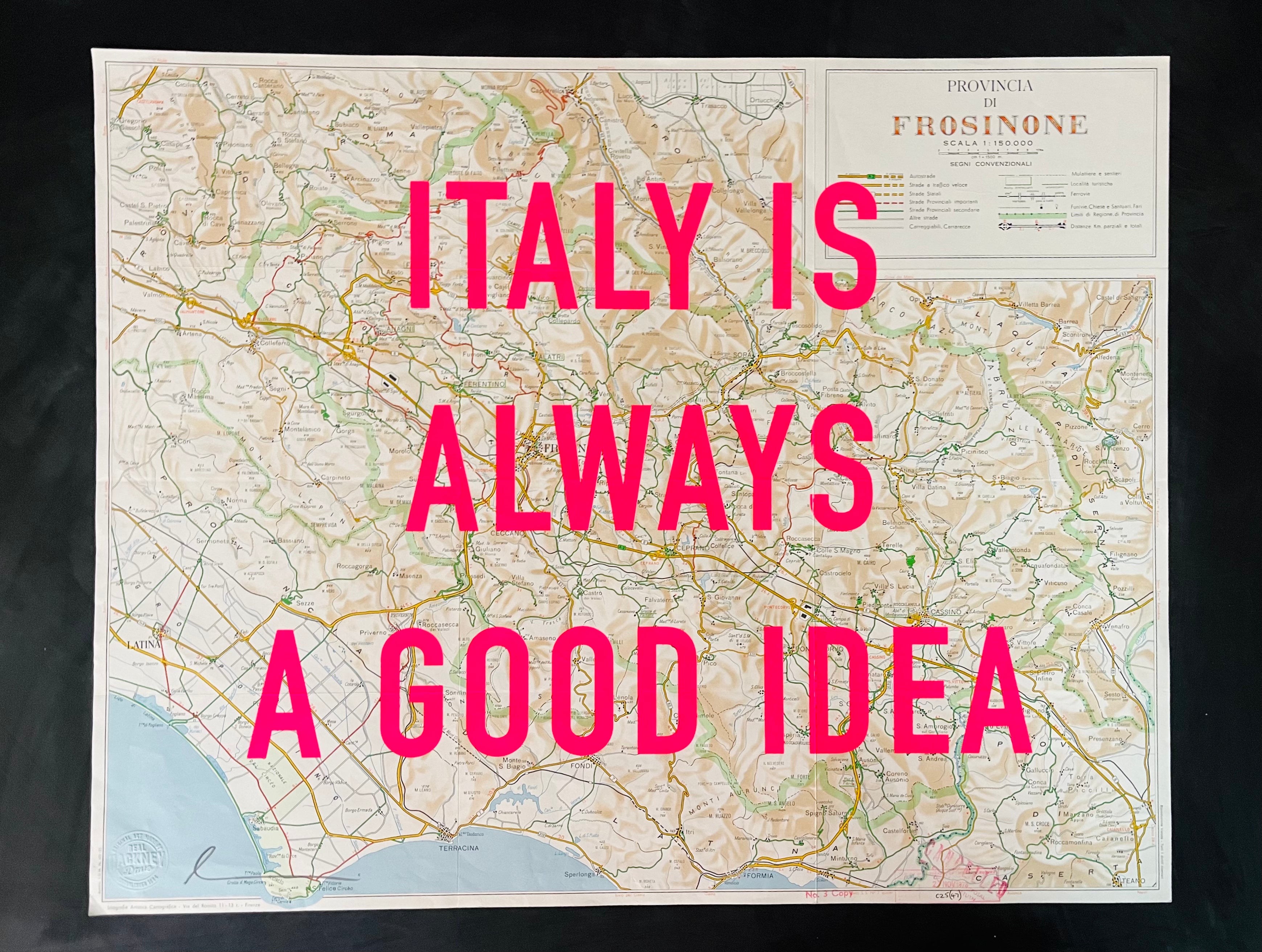 One layer screen print onto vintage maps of Italy Sizes vary